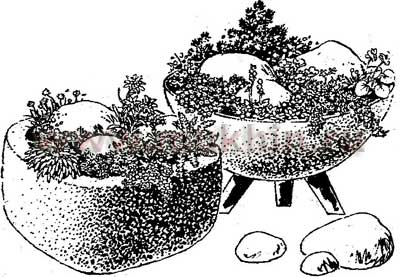 Мини-альпинарииМини-альпинарии стали в последнее время модны. Их организуют обычно там, где нет места для сооружения альпинария или цветочной стенки. Особенно увлекаются мини-альпинариями горожане, которые не имеют садовых участков. Чтобы создать мини-альпинарий, достаточно взять большую посуду, миску, сосуд — все, что имеется в хозяйстве (рис. 64). Разумеется, эстетически красивы керамические миски и изготовленные из дерева сосуды, декоративные ящики из этернита или из дерева. Глубина таких емкостей должна быть 15 см.