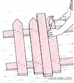 Штакетины (планки) делают с прямым верхом, с закругленным, с заостренным и более декоративной формы. Можно сделать забор из планок только одного вида, а можно скомбинировать разные. Прибиваем штакетины (планки) к слегам Нарежьте штакетины нужной длины и положите на пару слег. Прибейте каждую планку к каждой слеге двумя 3-сантиметровыми оцинкованными гвоздями по диагонали для лучшей фиксации. Для равномерного расположения штакетин используйте в качестве шаблона деревянную прокладку нужной ширины. Прибивая планки к слегам, оставляйте с каждой стороны секции концы слег длиной около 10 см для крепления к столбам. Крепим секции к столбам Сформированные секции крепят к опорным столбам так же, как и другие готовые секции. Секцию расположите между опорными столбами, подперев снизу кирпичами, чтобы низ штакетин был выше уровня земли на 6 см. Положите спиртовой уровень на верхнюю слегу и установите готовую секцию горизонтально. Прибейте края верхней слеги к столбу, проверьте еще раз горизонтальность, а затем прибейте к столбу нижнюю слегу. Таким же образом прибейте и другие слеги всех собранных секций. Штакетник